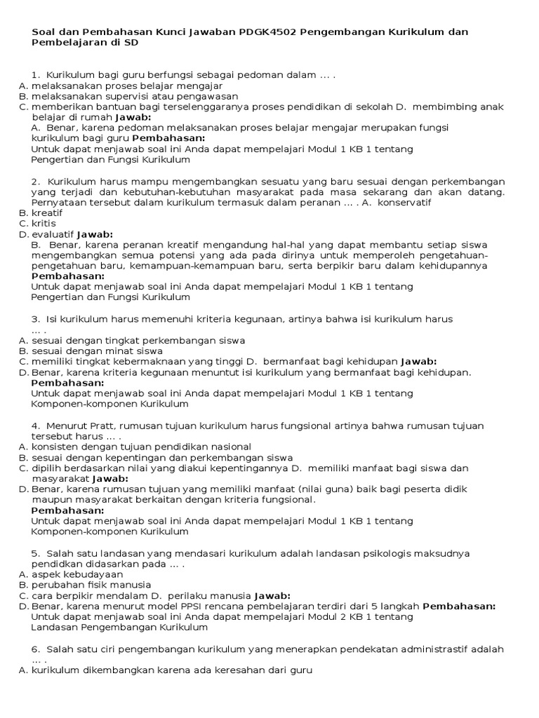 Soal Ujian Ut Pgsd Pdgk4502 Pengembangan Kurikulum Dan Pembelajaran D