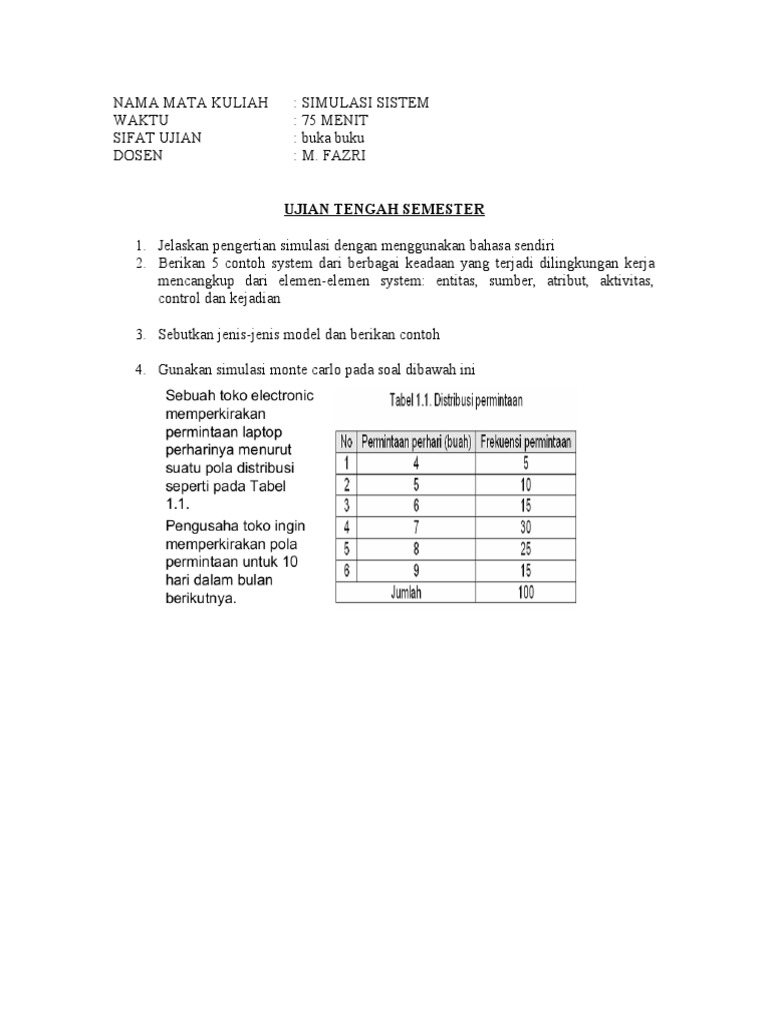 Contoh soal pemodelan dan simulasi. Kenaikan jumlah penduduk telah mengakibatkan kenaikan kebutuhan rumah dampak langsung dari kenaikan jumlah rumah ini adalah naiknya kebutuhan daya listrik yang terus meningkat dari tahun ke tahun. Pemodelan dan Simulasi Antrian Kendaraan di Gerbang Tol Laporan Kemajuan Pekerjaan 2004 oleh Wahju Sediono Pusat Pengkajian dan Penerapan Teknologi Informasi dan Elektronika BPPT Gedung II Lt. Tugas UAS Simulasi Dan Pemodelan Halaman 1 SOAL UJIAN AKHIR SEMESTER UAS SIMULASI DAN PEMODELAN 2006 A.