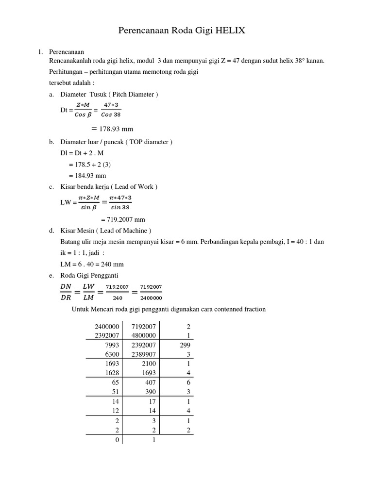 Soal roda gigi heliks Teknik Pemesinan. 1 Memahami dan mamapu membuat perhitungan pengefraisan helix. Read Online Roda Gigi Helix helik beta 10 derajad jumlah gigi z 30 dan hf 125 ma.