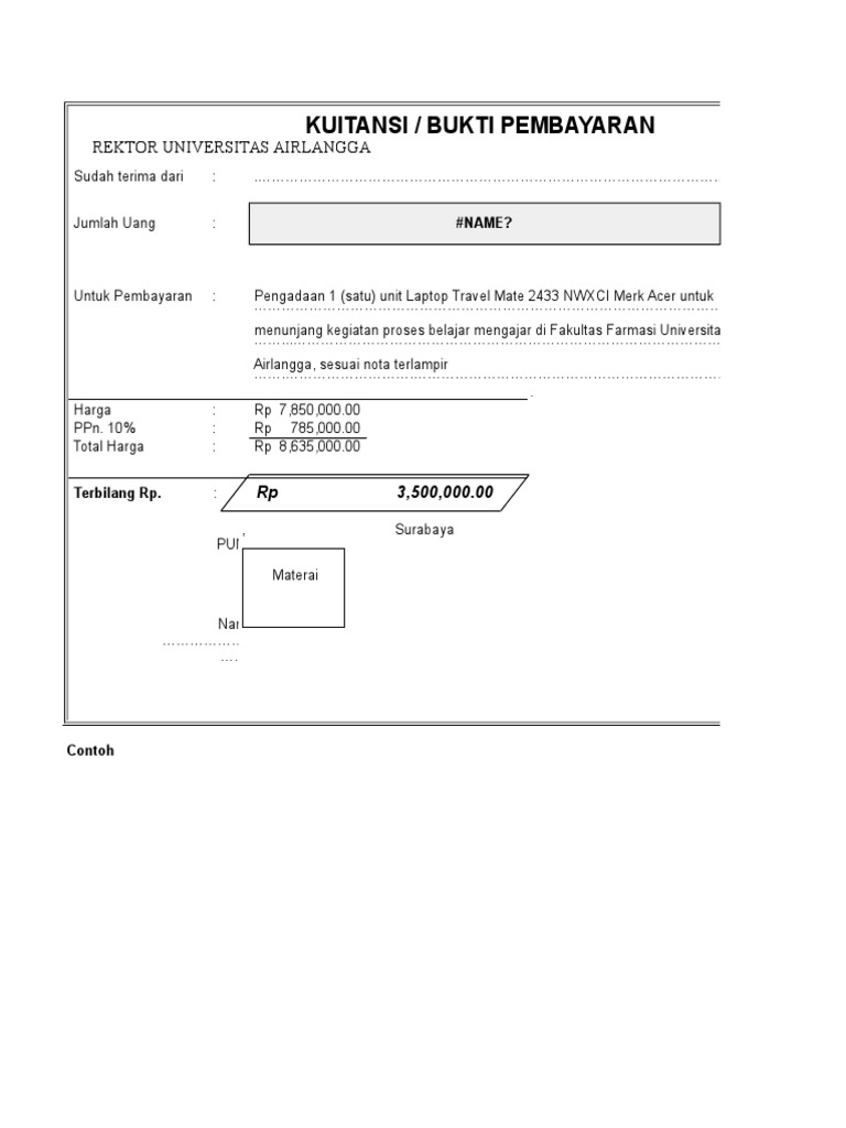 Contoh soal kwitansi. Download file dalam format xlsx Microsoft Excel. Kwitansi merupakan dokumen yang akan di jadikan tanda bukti transaksi pembayaran yang pada umumnya ikut di tanda tangani oleh pihak penerima uang. Contoh Kwitansi Kwitansi adalah dokumen yang merupakan alat bukti terjadinya transaksi atau pembayaranKwitansi perlu dibuat terutama untuk transaksi yang bernilai besar.