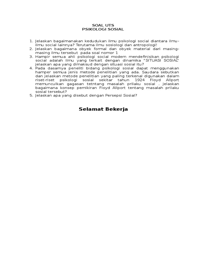 Soal uts psikologi sosial. Bagian dari kejiwaan yang mempunyai korelasi dengan aspek jasmaniah bersifat turun temurun dan tidak dapat diubah oleh pengaruh-pengaruh dari luar adalah pengertian dari. PSIKOLOGI SOSIAL Analisis Kasus yang Berkenaan dengan Teori Psikologi Sosial Syarat Kelulusan Ujian Tengah Semester untuk Mata Kuliah Psikologi Sosial Disusun Oleh. Karena itu bekerjalah dengan jujur dan jangan berlaku curang.