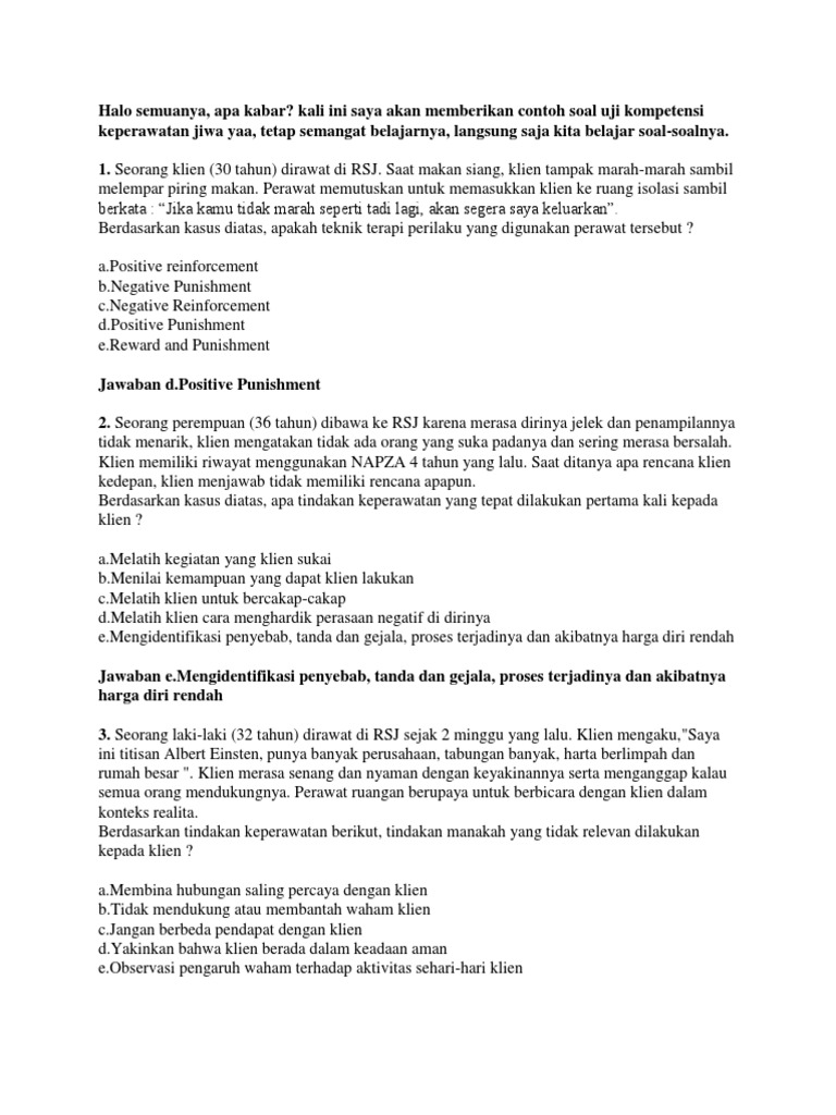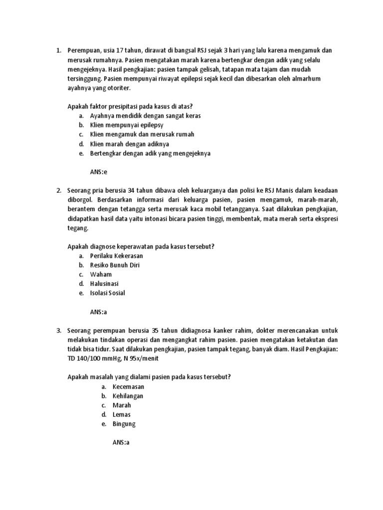 Contoh soal kasus keperawatan jiwa. Apakah tahapan komunikasi terapeutik selanjutnya yang tepat pada kasus di atas. Soal Keperawatan Jiwa 2017. Soal Neurobehaviour 2 Keperawatan Jiwa Skep B Smt Iv 2014.